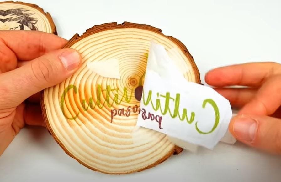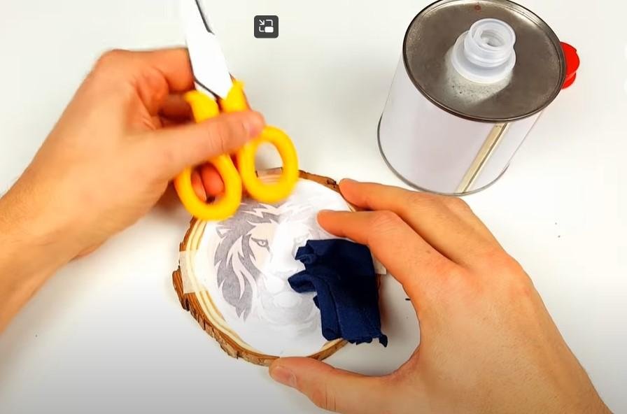 Cuarto; Humedecemos un paño con disolvente universal (thinner), vamos humedeciendo el papel haciendo presión para que la tinta se disuelva y transfiera a la madera.