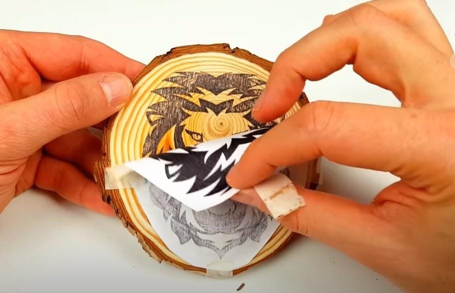 Tercero; Recortamos el papel de la fotografía, imagen o dibujo, colocándola sobre la madera, fijándola con cinta masking tape, cuidando que la cara de impresión quede de cara a la madera y bien estirada.